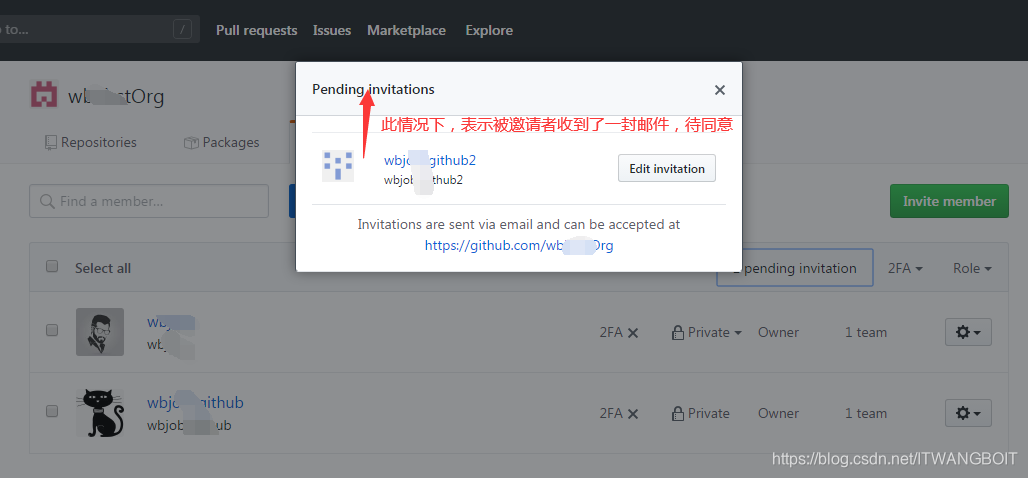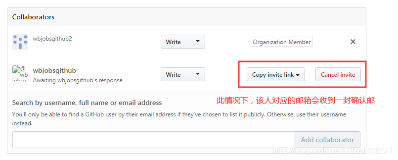 (2):选择的是和organization没有关系的人,则会给他的邮箱发封邮件,让其点击确认后,才可将其加入到Collaborators中;而且其仅仅是加入到仓库的Collaborators中,并不会成为组织的member。