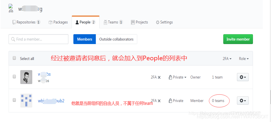 如果不勾选团队,则被邀请者作为组织内的自由人员加入组织。下图的第二个成员就是组织内的自由人员,不属于任何Team。