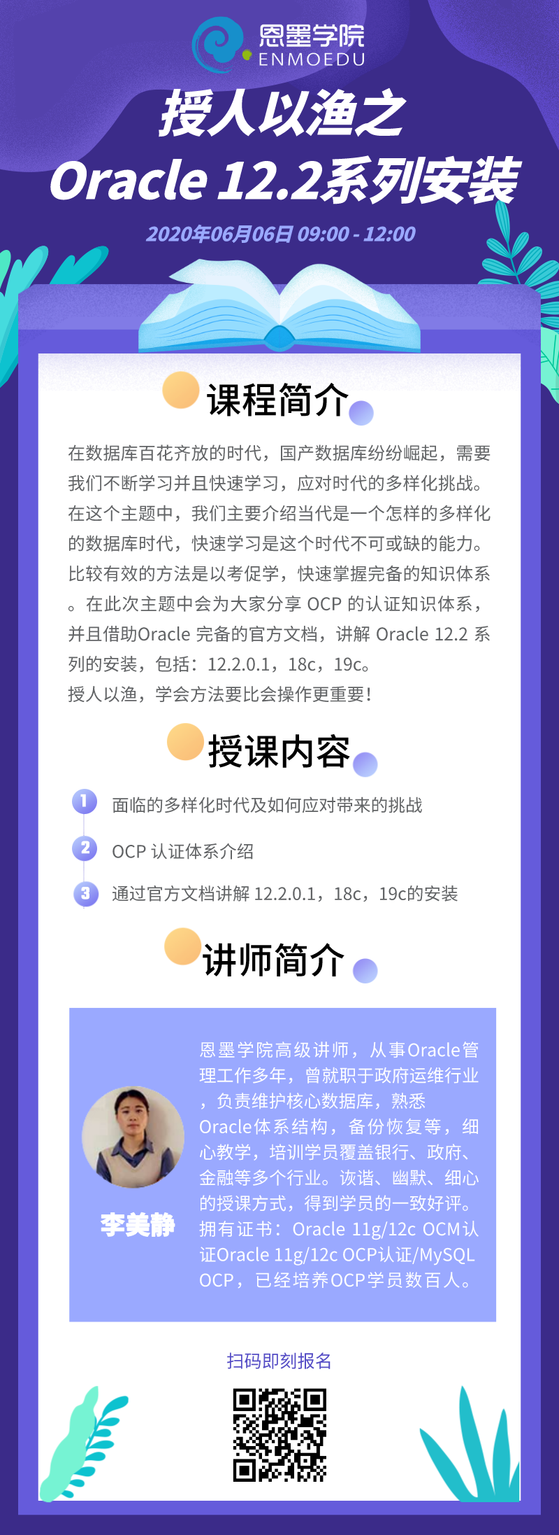 在本次公开课上,李美静老师主要介绍当代是一个怎样的多样化的数据库时代,快速学习是这个时代不可或缺的能力。比较有效的方法是以考促学,快速掌握完备的知识体系。在此次主题中会为大家分享 OCP 的认证知识体系,了解考试新动态,要想顺利拿证,不做paper OCP!学习官方文档通透原理+操作娴熟成为必备技能。本次课程会借助Oracle完备的官方文档,讲解 Oracle 12.2 系列的安装,包括:12.2.0.1,18c,19c。