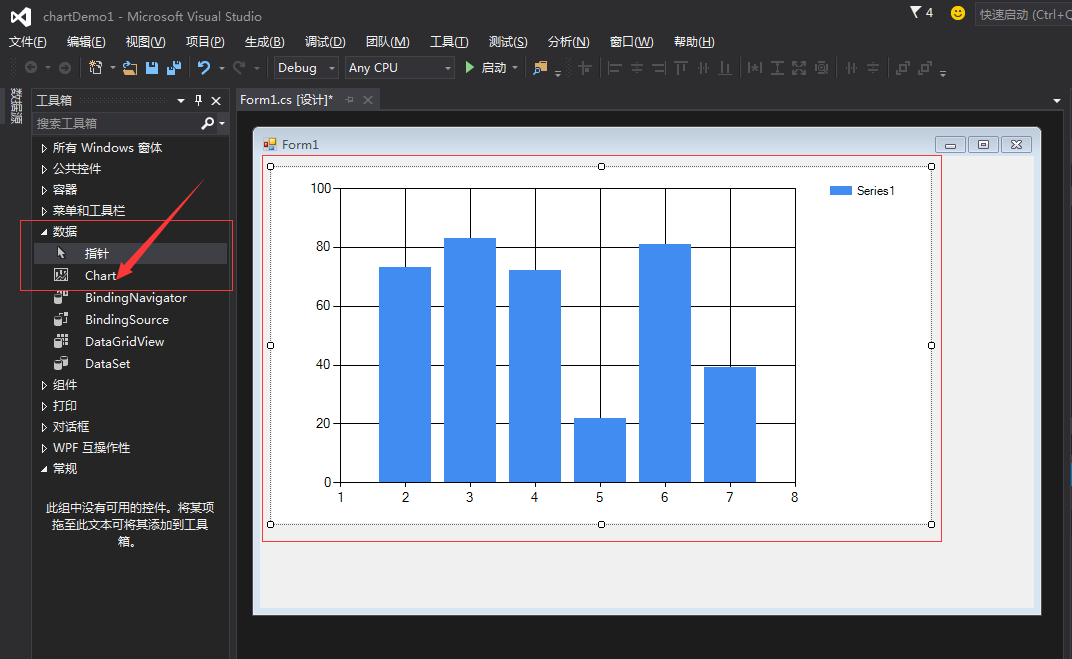 然后从工具那里 选择 Data 下面的 Chart 控件,并将其拖到Form1上,如图