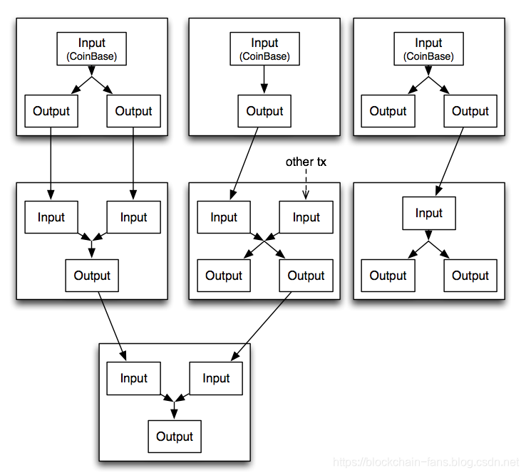 比特币的交易(Transation,缩写Tx),并不是通常意义的交易,例如一手交钱一手交货,而是转账。交易由N个输入和M个输出两部分组成。交易的每个输入便是前向交易的某个输出,那么追踪到源头,必然出现一个没有输入的交易,此类交易称为CoinBase Tx。CoinBase类交易是奖励挖矿者而产生的交易,该交易总是位于Block块的第一笔。