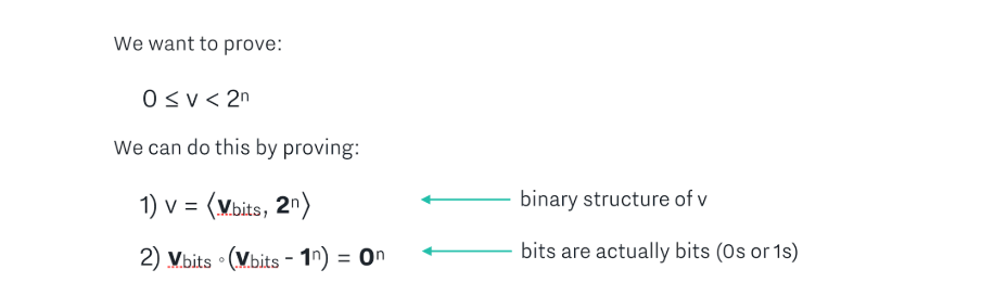 Next, we combine these two statements using challenge scalars, and add blinding factors to them. The math behind this is not difficult — just tedious — and ends up giving us an inner product statement in the form of c = <a, b>. That is, we arrive at a statement where if the statement is true, then we know that v is in range of 0 and 2^n. You can follow along with the step-by-step math for how that statement is created in our range proof notes.