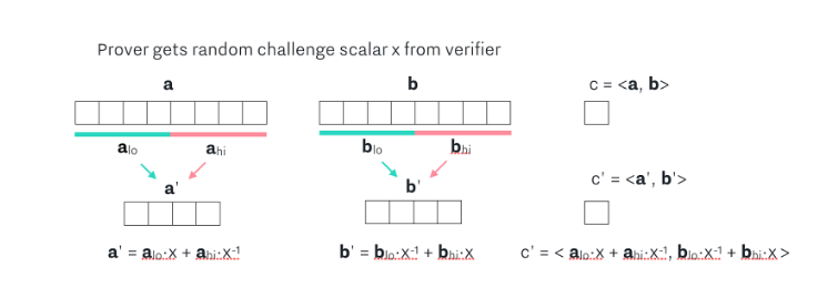 And then, we get a random challenge scalar x that we use to combine the hi and lo halves of a and b to create a’ and b’, which also gives us a new c’ = <a’, b’>.