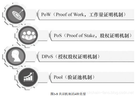 从目前的情况来看,区块链技术的共识机制主要有:PoW(工作量证明机制)、PoS(股权证明机制)、DPoS(授权股权证明机制)和Pool(验证池机制),如图1-9所示。
