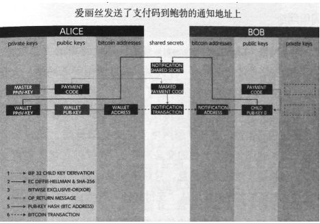 BIP47 (支付码)的构造与隐身地址有相似的特征,而它与隐身地址最大的不同之处在于,对于那些未来想要频繁联系的对象,需要提前将“通知交易(notification transaction)”发送至“接收通知的地址(notification address)”上。如图2-12所示,只需要这一步就能同时解决隐身地址“必须要找出区块链上所有交易”以及从节点上“就能明确辨识出存在特殊交易”的问题。