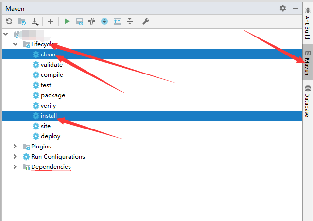 选择右侧,在Lifecycle中选择 执行clean,然后执行install就可以,注意不能再Plugins中执行