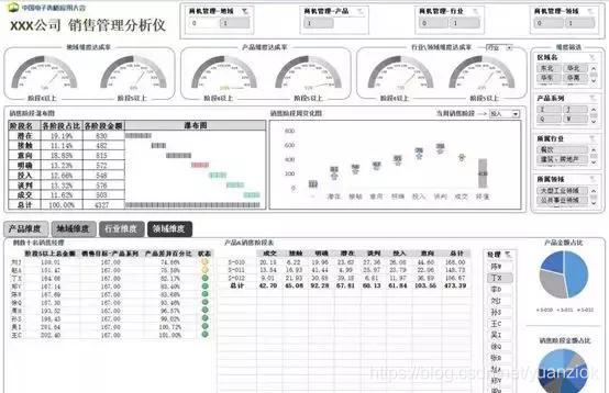 可视化的工具有很多,这里我推荐Tableau或者FineBI。这两款都不要编程功底,实现起来简单,功能强大。下图是Excel制作销售管理分析仪案例:
