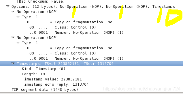 TCP Timestamps Option 由四部分构成:类别(kind)、长度(Length)、发送方时间戳(TS value)、回显时间戳(TS Echo Reply)。时间戳选项类别(kind)的值等于 8,用来与其它类型的选项区分。长度(length)等于 10。两个时间戳相关的选项都是 4 字节。