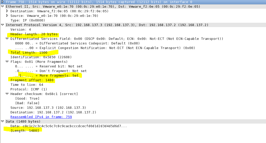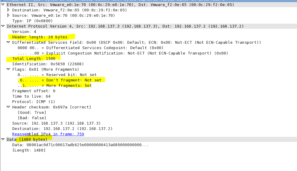这个包是 IP 分段包的第一个分片,More fragments: Set表示这个包是 IP 分段包的一部分,还有其它的分片包,Fragment offset: 0表示分片偏移量为 0,IP 包的 payload 的大小为 1480,加上 20 字节的头部正好是 1500