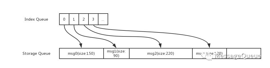 Index Queue是消息的索引队列,元素长度是固定的,比如元素内容为消息位置和消息大小(这样12个字节可以完整的定位出一条消息)