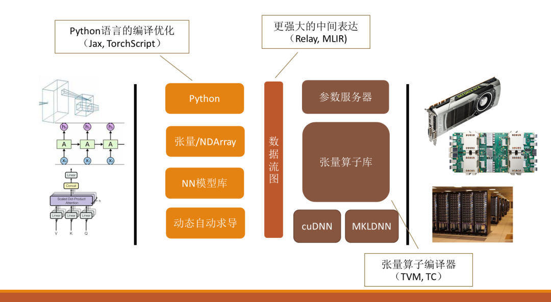 第二个区别是,前端也放弃模型配置文件了,Python成为了整个深度学习框架的一个标杆,通过Python提供张量运算的接口。随着Pytorch为典型的用户友好的框架的出现,NN模型库,包括动态自动求导成为了整个深度学习框架的标配。后端也逐渐把专用的算子替代成更丰富的张量算子库,同时增加了参数服务器,使得整个系统能够在多机多GPU的环境下训练。