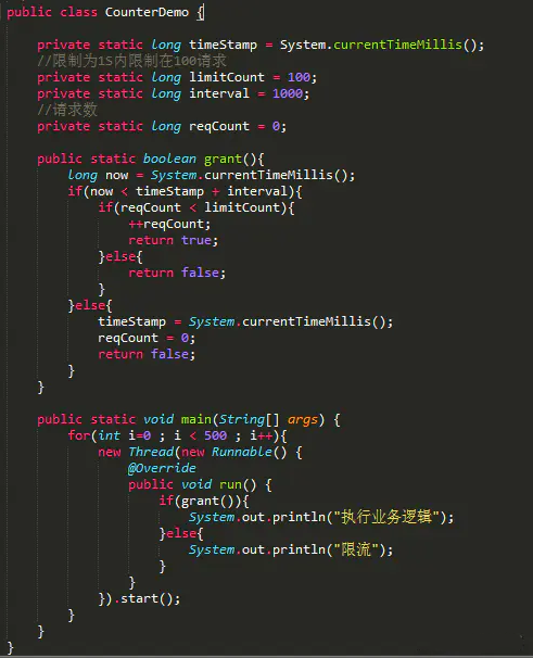 计数器计数器是一种比较简单的限流算法,用途比较广泛,在接口层面,很多地方使用这种方式限流。在一段时间内,进行计数,与阀值进行比较,到了时间临界点,将计数器清0。