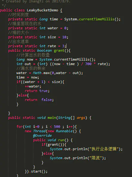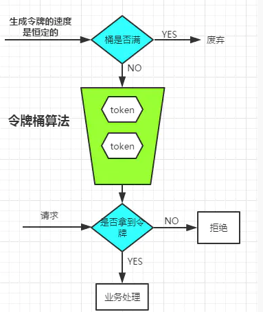生成令牌的速度是恒定的,而请求去拿令牌是没有速度限制的。这意味,面对瞬时大流量,该算法可以在短时间内请求拿到大量令牌,而且拿令牌的过程并不是消耗很大的事情。(有一点生产令牌,消费令牌的意味)