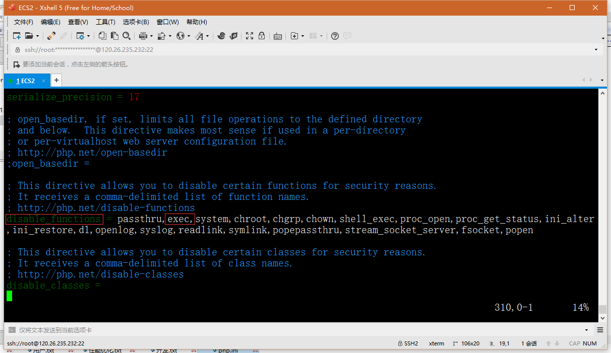 10、编辑php.ini文件,查找disable_functions,删除exec,保存,如图10