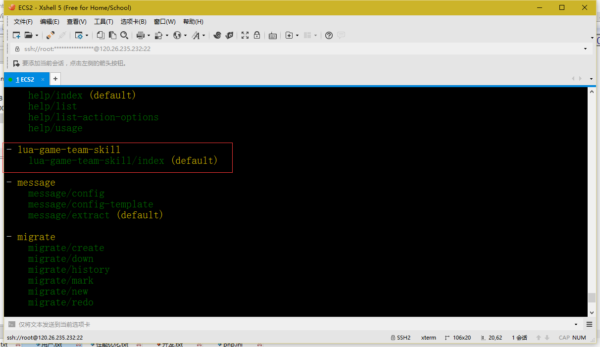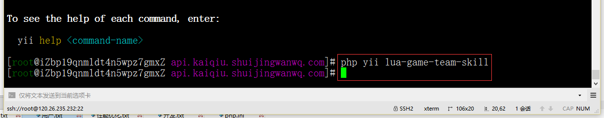 重启php-fpm,再次运行php yii,成功显示可用命令列表,lua-game-team-skill命令已经存在