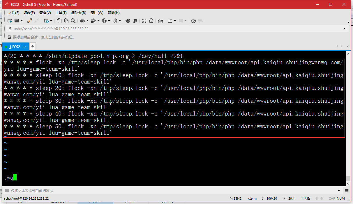 * * * * * sleep 20; flock -xn /tmp/sleep.lock -c ‘/usr/local/php/bin/php /data/wwwroot/api.kaiqiu.shuijingwanwq.com/yii lua-game-team-skill’