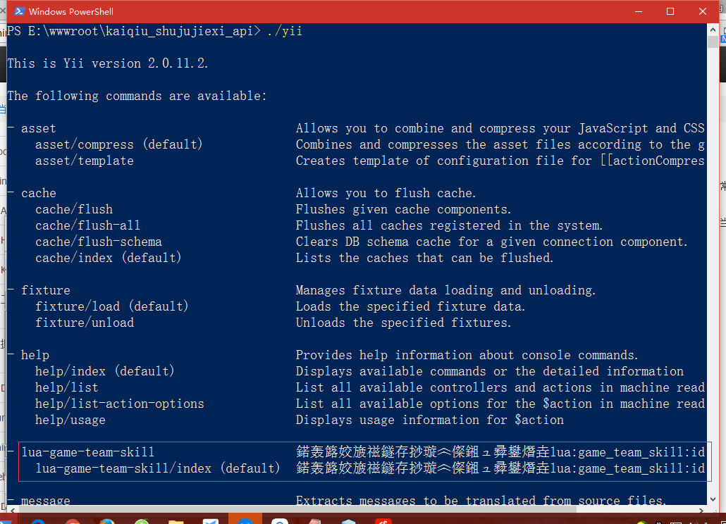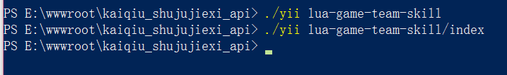 在Windows PowerShell中,进入程序根目录,运行 ./yii,,会给你一些可用的命令列表,其中增加了可用命令 lua-game-team-skill