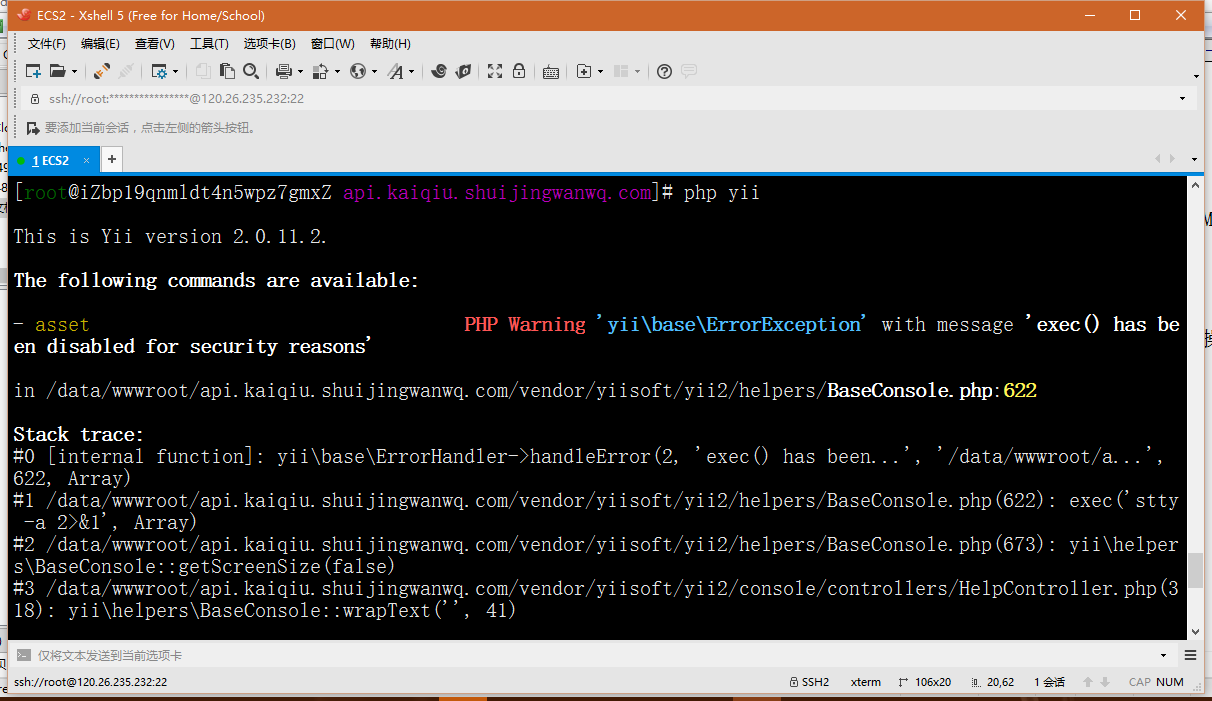 9、在根目录下运行 php yii,报错 PHP Warning ‘yiiaseErrorException’ with message ‘exec() has been disabled for security reasons’,如图9