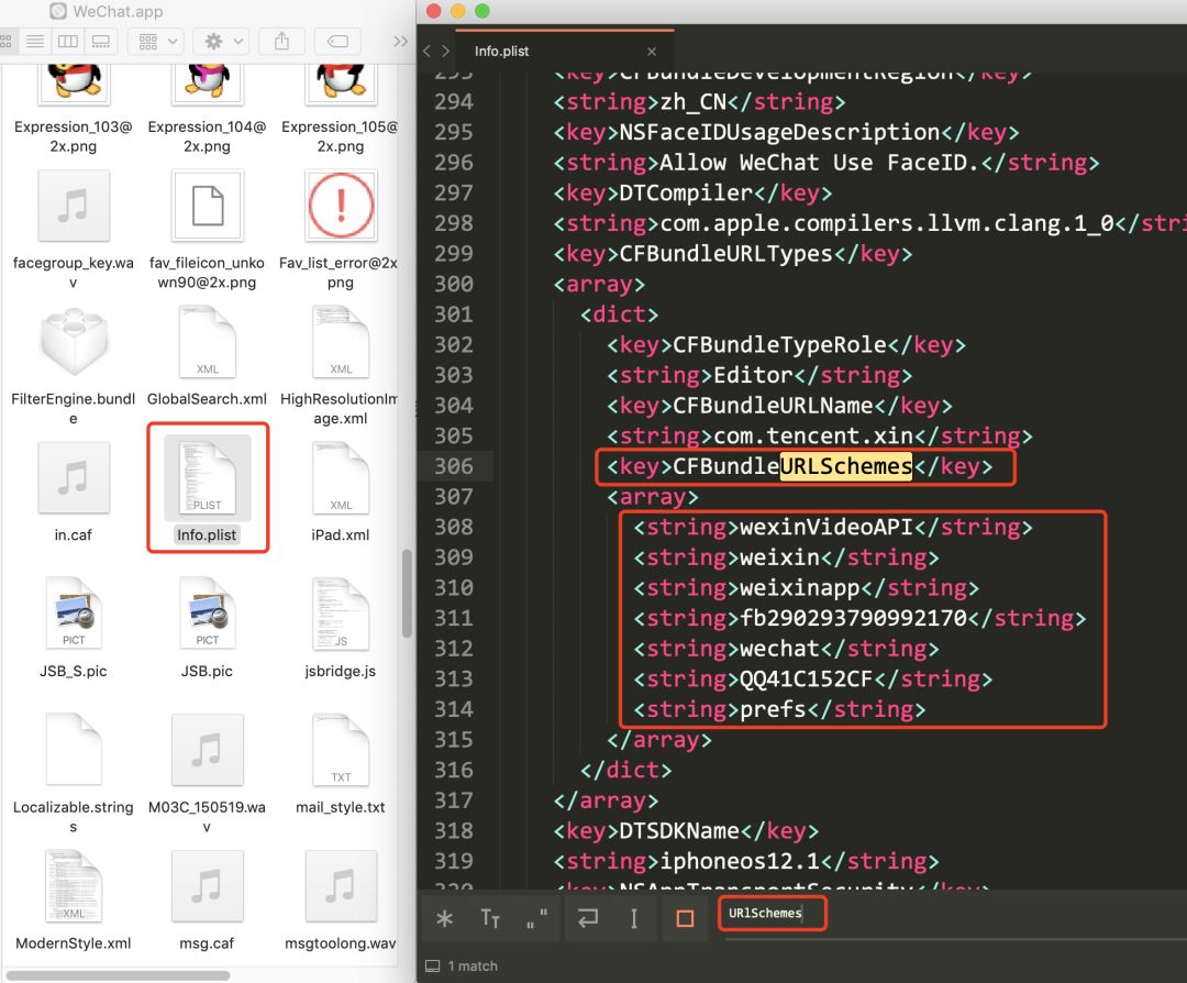 找到Info.plist文件并打开,搜索关键词URLSchemes: