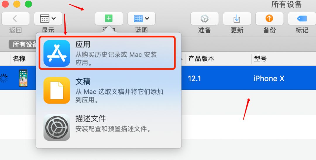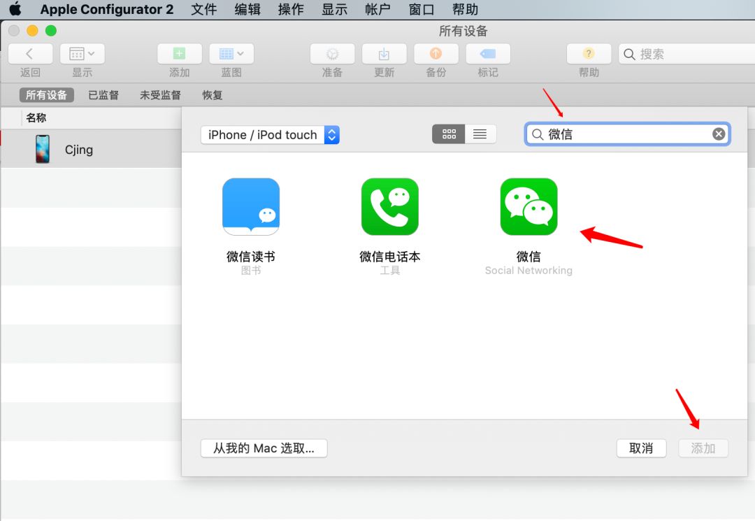 假设你需要获取微信的URL Schemes,那么你的手机已经安装过了微信,然后使用该软件进行添加,选中设备点击添加按钮,选择应用: