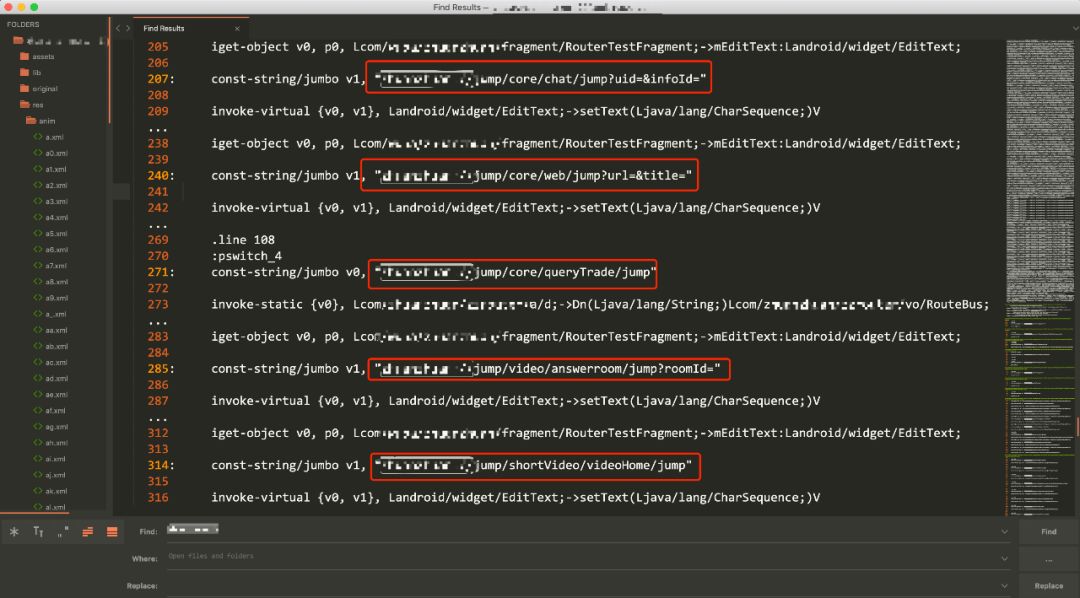 至于安卓的APK的逆向可以参考i春秋社区中的< 打造Mac下APK逆向环境到实战接口XSS挖掘 >,可以在源代码中、所有文件内容中搜索URL Schemes。