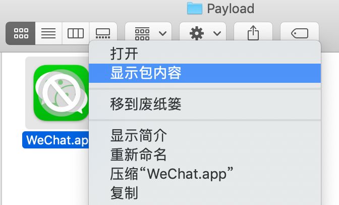 将IPA包后缀名修改为ZIP,然后解压,进入Payload目录会看见一个.APP后缀名文件,选中文件右击显示包内容: