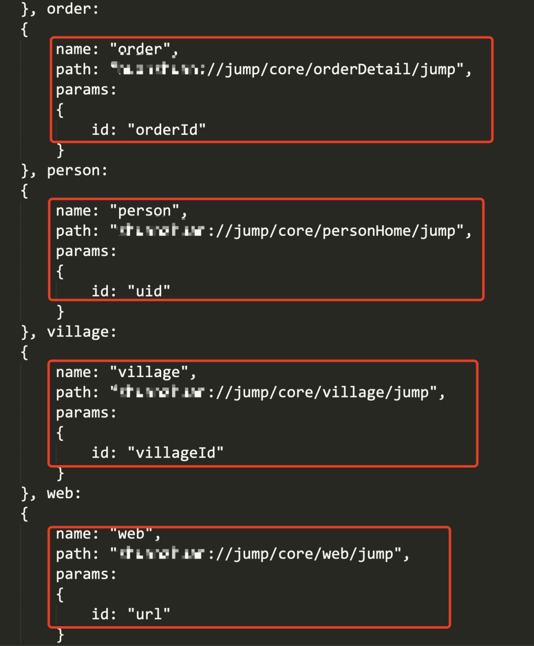 有些还有参数,可以根据命名来猜这些URL Schemes的含义,例如path: "mst://jump/core/web/jump",就可以知道这个是做Web跳转的,那跳转到哪个地址是什么参数控制呢?下面也有对应的告诉我们是url参数去控制,也就组成了这样一个URL Scheme: mst://jump/core/web/jump?url=https://gh0st.cn