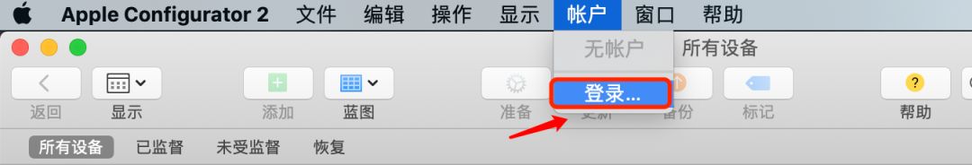 Mac上先安装Apple Configurator 2,然后你需要在该软件中登录你的Apple账户: