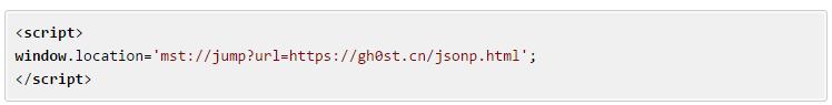 用户点开之后启动mst应用执行jump动作,跳转到https://gh0st.cn/jsonp.html,jsonp.html内容: