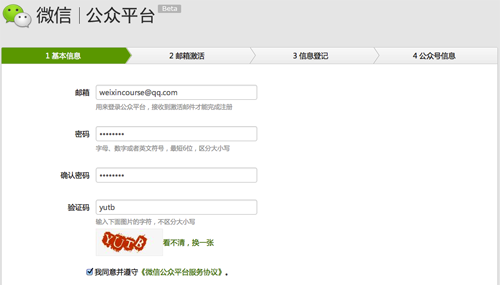 填写注册的邮箱(现在没有qq号注册了,个人觉得更好,新注册的qq号太长太难记)和设置密码,记得协议选项打钩,协议里有一段公众账号所有权其实是归微信所有,so这个霸王条款大家都懂的,免费的嘛。