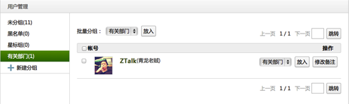批量分组。将需要分组的用户头像前面的check框选中,然后统一放到一个组别。
