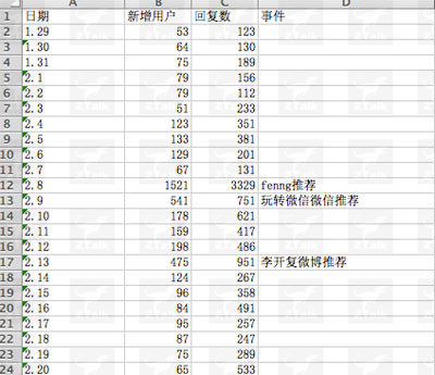 ZTalk秘籍 公众平台后台只保留最新7天的新增订阅用户数和接收消息数,可以做一个execl表格手工来做个记录,方便做一些数据分析或者日志记录,格式非常简单,如下图: