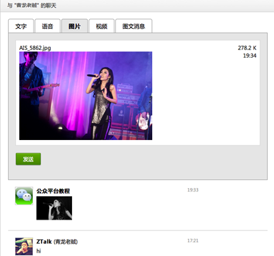 点击用户头像会跳转到与用户一对一的聊天页面,除了可以发文字外,还可以发送表情、语音、图片、视频、图文消息等,对于一些企业客服来说,方便发送一些预设好的咨询回复。该页面只显示最新的20条互动消息,包括用户发送和公众平台回复消息。如下图: