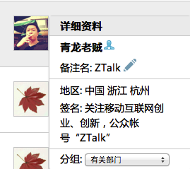 鼠标移动到头像上会显示用户信息卡,有昵称、性别、备注名、地区、个性签名、用户分组等。用户信息里没有用户的微信账号,在公众平台里与用户进行信息交互都通过唯一的openid,主要是为了保护用户不被骚扰。如下图: