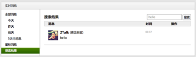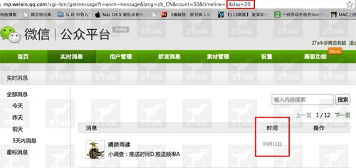 ZTalk秘籍 想查7天之前的消息怎么办?先点击“5天内消息”,然后将浏览器地址栏的URL“day=3”改成“day=20”,就可以查看20天以前的消息,如下图: