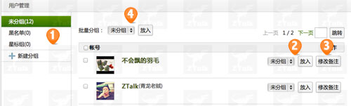 用户分组。点击分组下拉框选择组别,然后点击放入就可以将用户进行分组,被分组的用户将消失在当前组别列表中。用户将出现在另外一个分组。