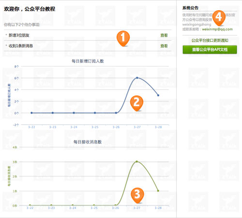 在上次点击用户管理和实时消息两个导航选项后新增加的用户数和消息数,这话有点拗口,但实际就是这样,点击“查看”会分别跳转到用户管理页面和实时消息页面,然后这些数据就分别清零,直到再有新的用户关注和新的消息回复。