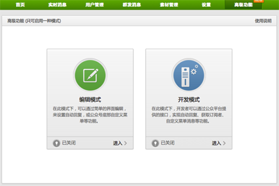 点击公众平台后台导航的“高级功能”就可以进入,该页面有两个模式选择,分别为“编辑模式”和“开发模式”,如下图: