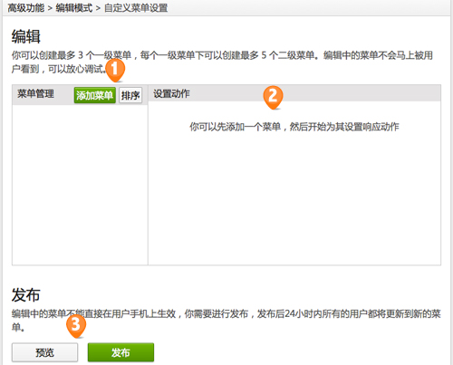 预览和发布按钮,发布即同步到公众账号手机端,用户在24小时内都将更新。