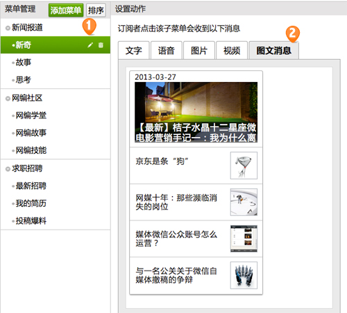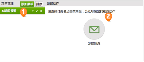 在未添加任何子菜单时主菜单也可以添加发送消息的动作,即在公众账号点击主菜单时发送一个图文消息或者多媒体信息;