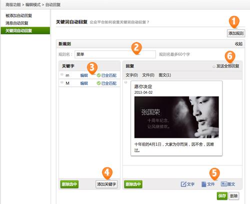 关键字列表。当用户输入那些字符时自动返回消息,这里要注意的是记得将全匹配打钩,否则只要用户输入的一串文字中带有这个关键字时,就会发送消息。