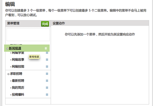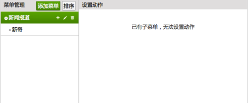 菜单动作设置框。自定义菜单目前只有两个动作,一个是点击显示子菜单,一个是点击发送消息。