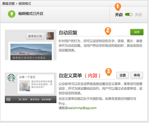 公众平台的编辑模式介绍基本就是这些,比较简单,但越是简单的东西只要你肯用心思考就能玩出不同的东西,下一期为大家带来实例操作,由于大部分公众账号都没有自定义菜单,因此实例主要是用自动回复功能实现。
