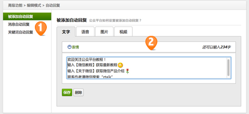回复消息设置框。被添加自动回复和消息自动回复的消息设置框是一样的,只支持文字、语音、图片和视频回复,文字最多300个字符,英文汉字一样计算,语音、图片和视频从素材库选取。