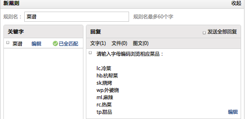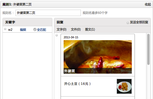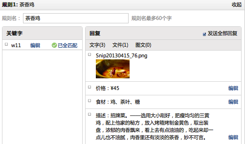 每个菜品做一条关键词自动回复,将菜品的图片、价格、描述分解成三个回复,根据关键字全部发送。如下图: