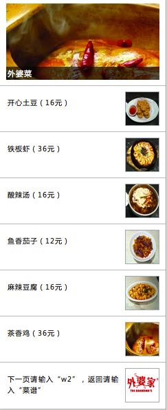 多图文消息展现,封面图文消息用来做菜品类别,添加六条菜品信息格式为菜品名称+价格,最后一条用来做翻页提示。如下图: