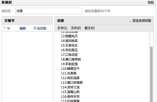 如果一个菜品类别下数量比较多,单条文字消息字数超过的话,也可以设置多条文字消息,选择发送全部回复。