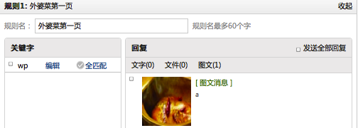 采用第二种菜品上传方案的,直接用关键字自动回复添加多图文消息即可,注意翻页关键字的设置,如下图: