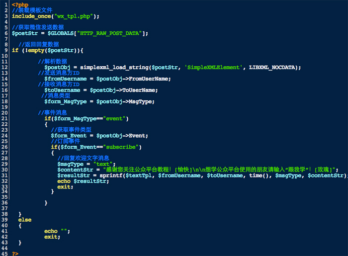 第21行,判断消息是否为事件消息,现在微信公众账号的用户关注和取消订阅都是通过事件消息发送,因此咱们要欢迎用户关注首先得判断来接收的消息类型是否为事件。这里要强调的是在php里一个“=”用来赋值,“==”用来比较是否相等,大家千万注意在判断语句时如果少写一个“=”号这个判断会永远成立。