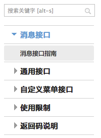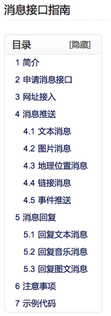 先不着急点开关,点了也没用,会提示必须先成为开发者,但第一步也不是点击“成为开发者”按钮,而是点击查看文档按钮,我们要去下载一个文件,进入开发指南页面后点击左侧菜单的“消息接口指南”,如下图: